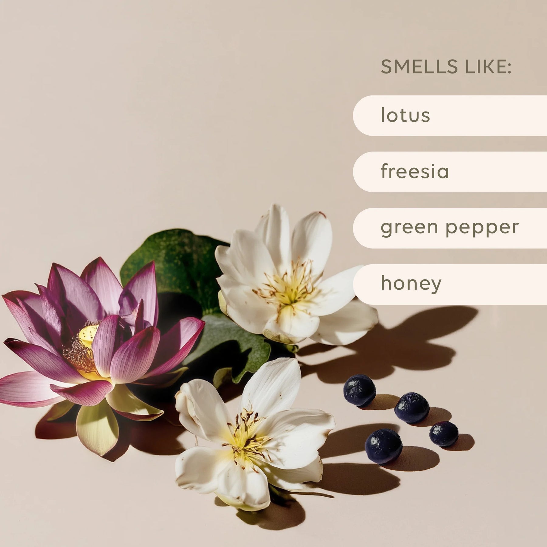 A sophisticated Soy Candle offering a modern twist on floral elegance. Crisp green pepper and fresh lotus create a clean, contemporary scent, while warm sandalwood adds depth. This unique fragrance creates a refreshing, zen-like atmosphere.
